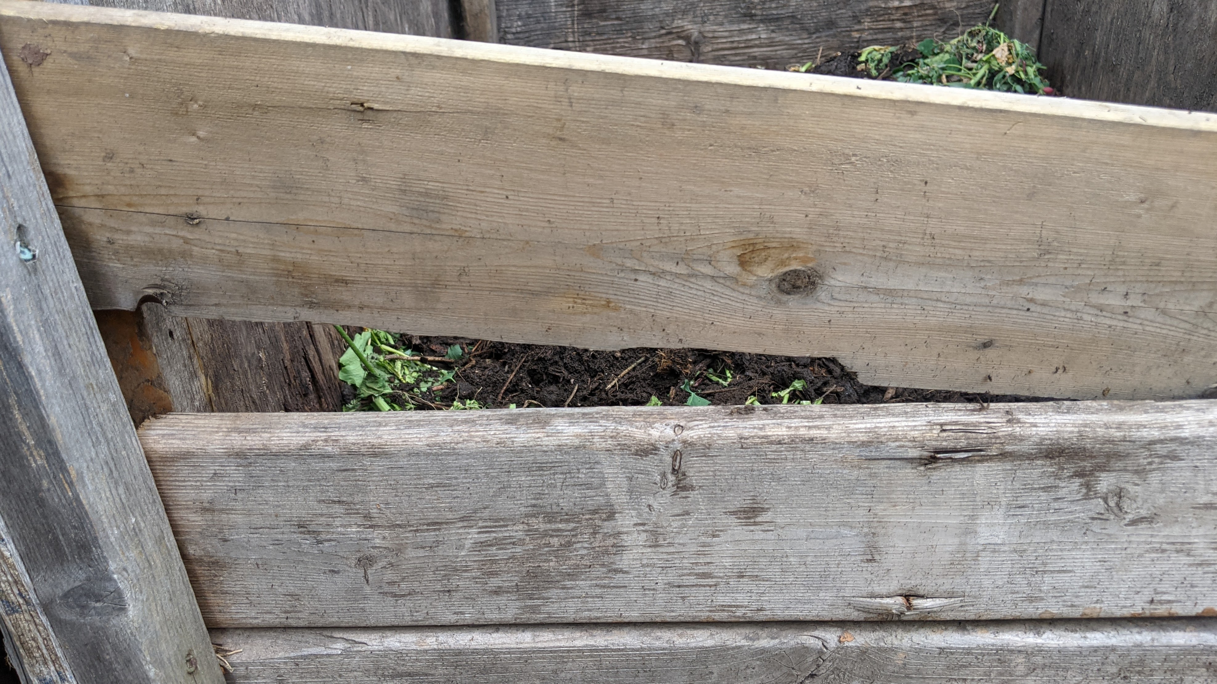 | Where you deposit organic material | Closed off while the decomposition takes place. Do not touch this. | Compost ready to use. Help yourself. |