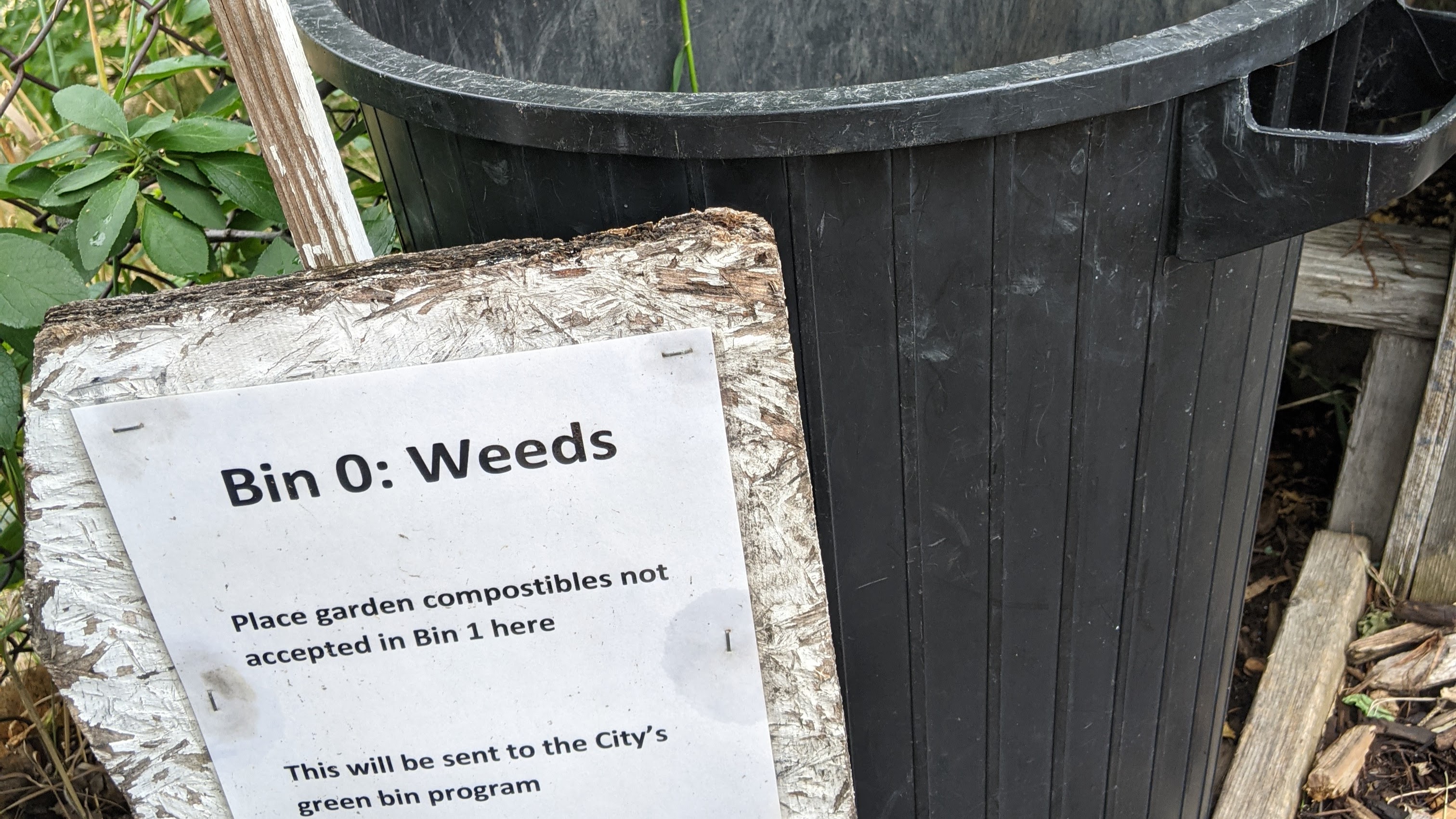 There is a bucket by Bin 1 into which you may place green waste items that are not suitable for the compost pile: seedy flowers, propagating roots, woody stalks etc. Please do not put stuff in here simply because you can not be bothered to cut it up. The pile needs your organic waste and remember someone must carry the contents of this bin to a city green bin.